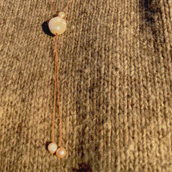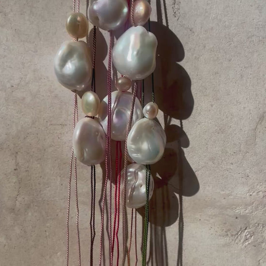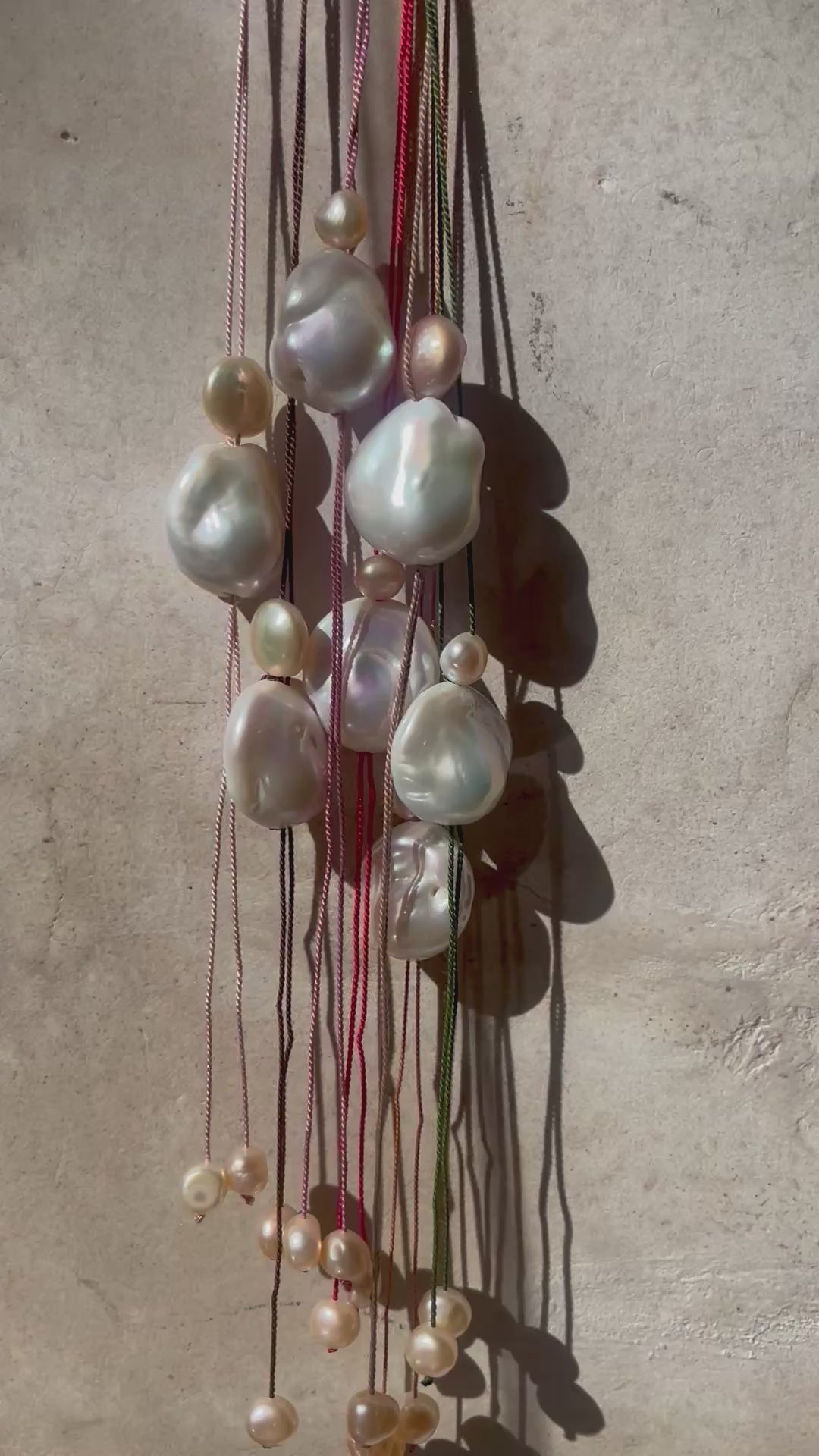 Large baroque pearl + silk cord + fresh water pearls. Necklace can be adjusted to be worn at any length.